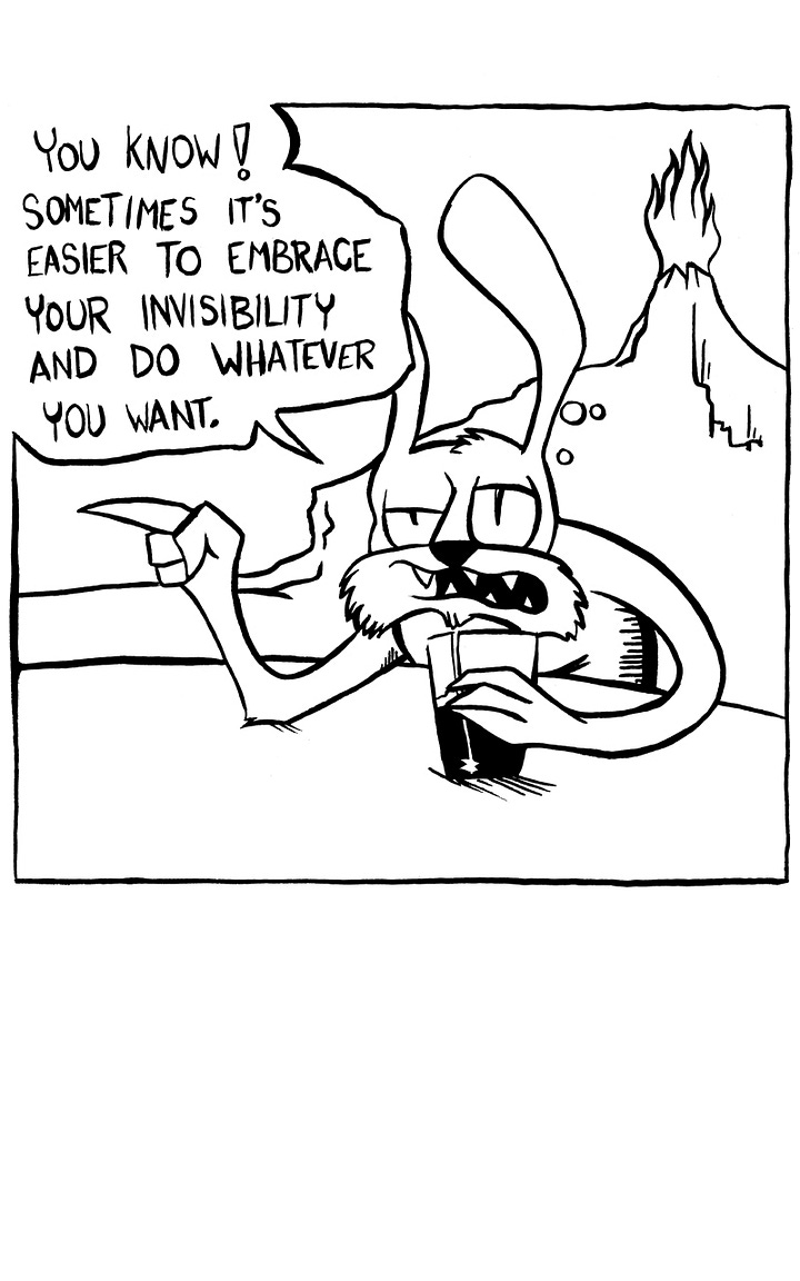 Several weeks later, while on an artist residency, my colleague and friend, Altman, mentioned that life goes on. “Credits didn’t roll and that’s hard to deal with,” he told me as we drove across state lines. I was shocked because he knew something I didn’t. Putting out a single comic was a goal I had set for my mid-30’s, and here I was, at twenty-eight with that goal behind me. Everywhere I went, I still encountered myself. My life hadn’t changed. So what did anything mean? I sank deeper, unable to comprehend that being on that artist residency was a big deal. My second artist residency ever, and this Altman guy helped me negotiate it into two weeks at full-pay. I had just begun to live as an artist, and yet I felt like nothing meant anything.